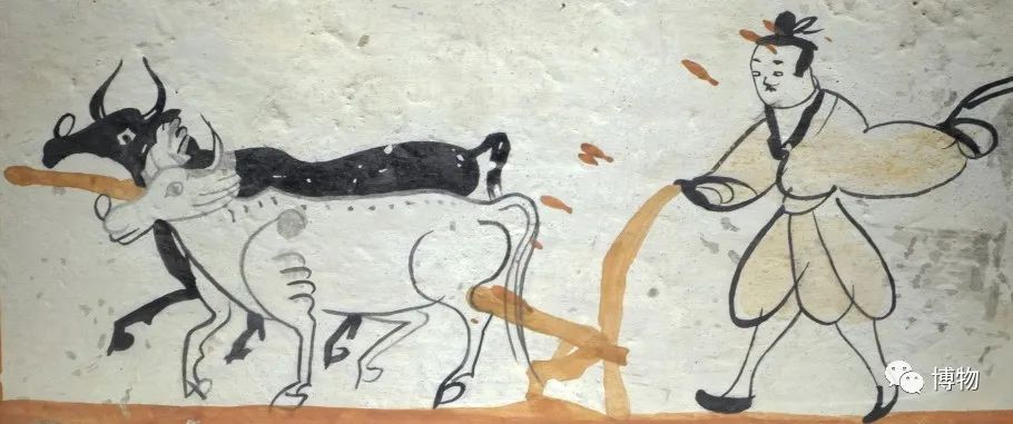 魏晉墓葬中的畫像磚,常繪有牛耕場景:既有較古老的“二牛抬杠”(上圖),也有當時新出現(xiàn)的“一牛一犁”(下圖)。后者勞動效率更高,成為后世主要的牛耕方式。