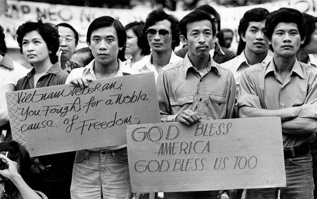 · 1981 年,休斯敦的越南難民紀(jì)念南越崩潰六周年,打標(biāo)語致敬美軍老兵